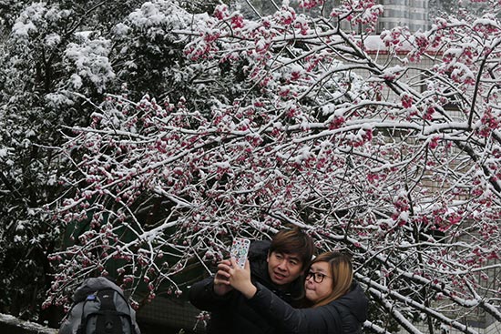 图:台北市阳明山24日积雪深厚,一棵盛开的樱花被白雪覆盖,民众拿起手机 自拍留念/中央社