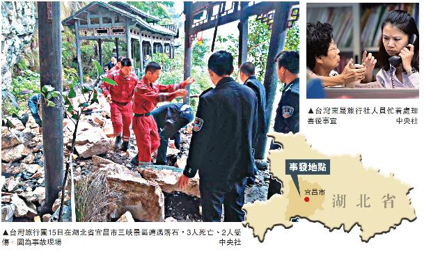 大公报10月16日讯 综合新华社、中新社及中央社报道:湖北宜昌三峡景区15日上午发生滚石坠落,造成3名台湾游客遇难的事故。罹难者均来自台湾电影戏剧商业同业公会,包括国宾影城行销总监、电台主持人葛世强,高雄市三多影城老板王雪红、排片人李自强。国台办发言人马晓光应询表示,我们对遇难同胞表示深切哀悼,向家属表达慰问。海协会和海旅会将组成工作组,派员赶赴前方协助处理善后工作。
