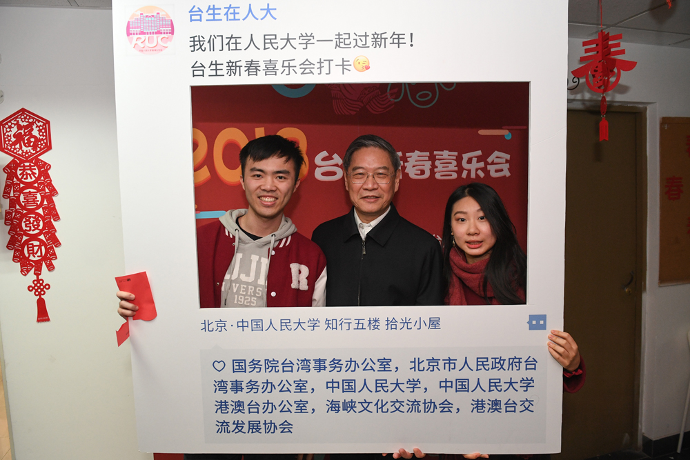 图:20日,国台办主任张志军来到北京中国人民大学,走访该校台湾师生。图为张志军(中)与台湾学生陈泓维(左)、杨思婷(右)合影并在朋友圈“打卡”/中新社