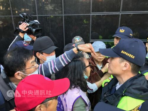 反年金改革团体在上午6时许,搭乘游览车抵达台行政机构聚集,抗议立法机构审查军人退抚新制相关修正案,抗议人士推倒青岛东路的铁门,冲进立法机构围墙内,站在议场门前抗议。