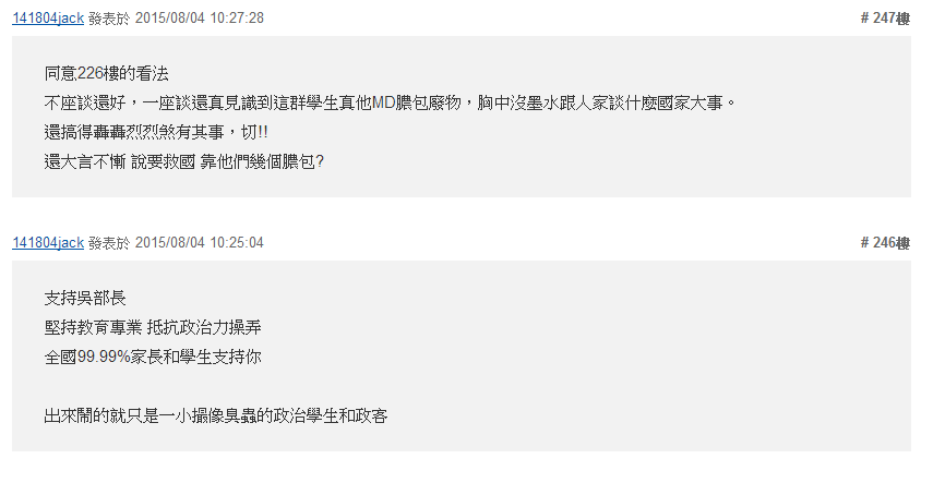 台中一中廖崇伦表示,会拍桌走人是因为吴思华无法回应诉求,有人批评他们占据“教育部”广场,挡住商家,他哭着说,社会只对掌握权力、滥用权力的人宽容,对最弱势的人残忍,“衣冠楚楚的大人才是社会上最残忍的一群,跟我们讲一些废话!”