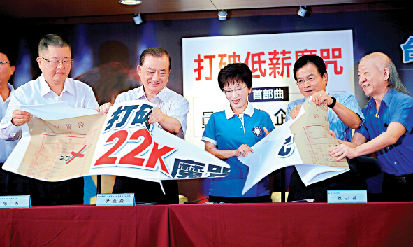 图:国民党“总统参选人”洪秀柱(左二)16日举行记者会,主张“员工加薪,企业抵税”/中央社