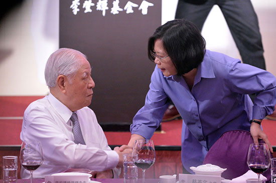 图:“李登辉基金会募款餐会”22日举行,民进党主席蔡英文(右)向李登辉(左)致意/中央社