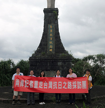 图:“两岸记者重走台湾抗日之路”活动近日在台湾开启。图为在盐寮抗日纪念碑前采访团成员合影\中新社