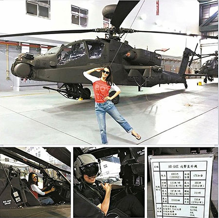 图:艺人李蒨蓉在军官友人的带领下,坐进“阿帕奇”机舱,还将照片张贴上网,引发轩然大波/网上图片