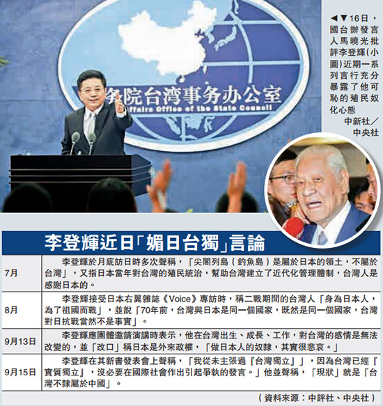 大公网9月17日讯(记者张宝峰)在国台办16日例行发布会上,发言人马晓光在回应李登辉近期言论时表示,充分暴露了他错乱的历史观、可耻的殖民奴化心态,出卖民族利益者终究会被钉在历史的耻辱柱上。马晓光亦表示,两岸同胞需警惕“台独”势力否定抗战成果以挑拨两岸同胞感情。