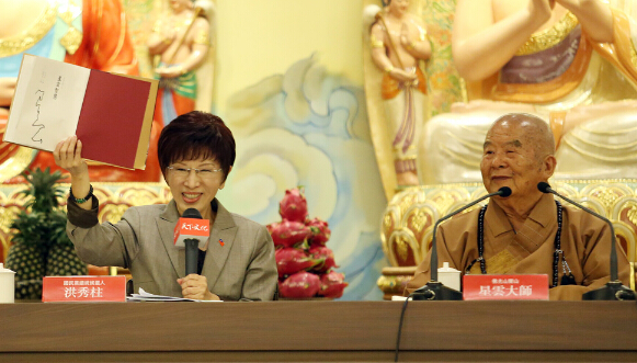图:洪秀柱(左)21日出席星云大师(右)的新书发表会中央社
