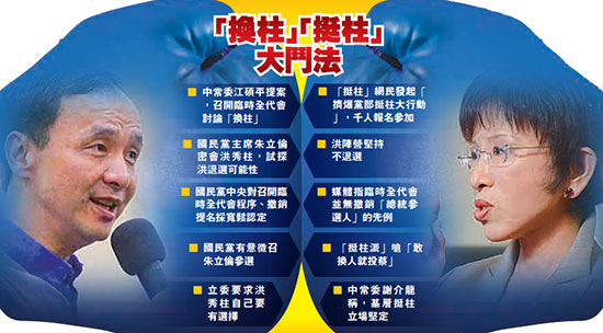 大公网10月6日讯 最近国民党内“换柱”和“挺柱”两派人马斗争激烈。据报道,国民党权威人士5日证实,国民党决定“换柱”,将征召党主席朱立伦参加大选。但多个挺柱团体5日则在脸谱上发起“挺柱”活动,谴责“换柱”会让国民党选情崩盘。有学者认为,“换柱”操作如此粗糙,其后坐力恐将冲击选情,对国民党未必有好处。