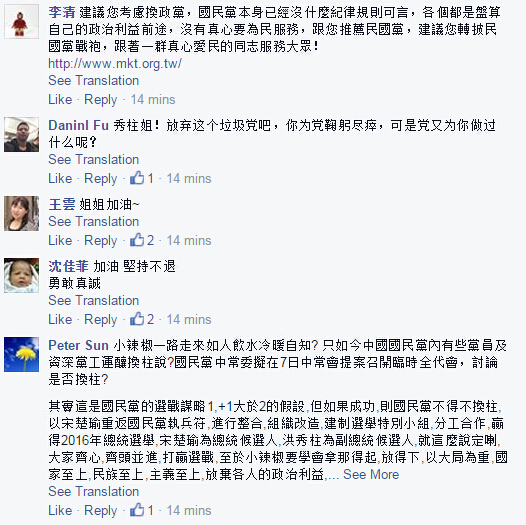 自提名之日,我告诉自己,既然承接了重责,哪怕它是千斤重担,我也会勇敢地扛下去。近来我听到一些声音要我自动辞退,以避免国民党可能的大败,或影响到立委的选情。我虽然不同意这种观点,但我完全理解他们对我、对党、对选情的关心,以及对党未来的忧心。