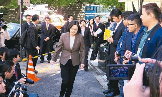 图为蔡英文8日拜会日本民主党党部,四周布满媒体