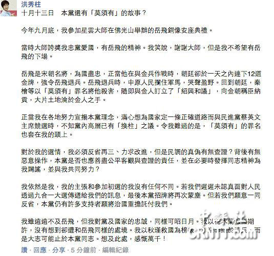 朱立伦致党代表的公开信曝光后,洪秀柱13日晚又在脸书发文“叫屈喊冤”。