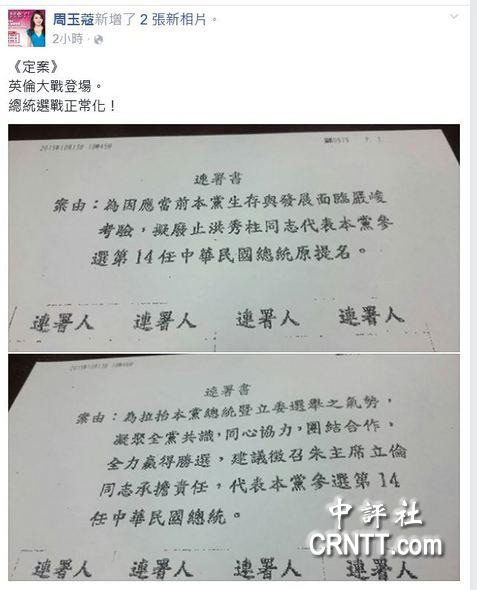 随后,周玉蔻又在脸书另一账号上曝光两份临全会的连署书,第一份连署书是废止对洪秀柱的提名,第二份连署书是征召朱立伦代表国民党角逐2016大选。