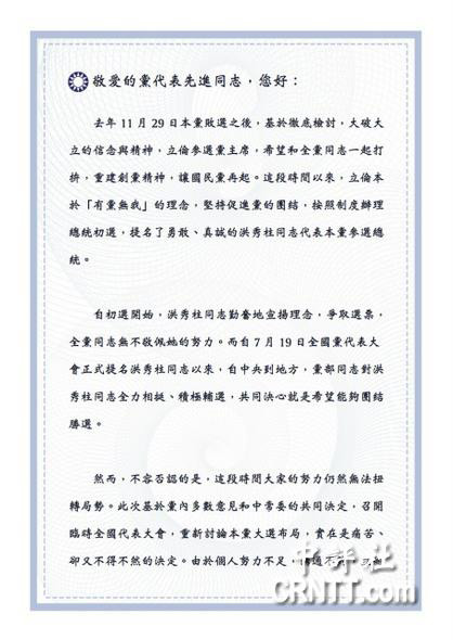 朱立伦在信中强调,自719全代会后,党内所有同志全力辅选,希望洪能胜选。但是,对于此前多次出现的朱洪互动的尴尬局面,朱立伦却只字不提。随即,他话锋一转,称这段时间的努力仍无法扭转选情低迷的局面,于是决定召开临全会,“实是痛苦却又不得不然的决定。”
