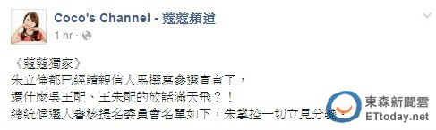 朱立伦一边致信党代表呼吁支持临全会,另一边也在暗暗着手竞选事宜。名嘴周玉蔻13日在脸书贴文表示,“朱立伦都已经请亲信人马撰写参选宣言了,还什么吴王配、王朱配的放话满天飞?!”,并称朱立伦掌控一切立见分晓。