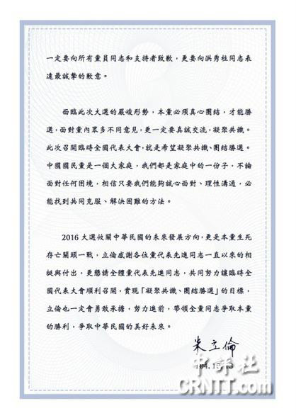 朱立伦致信党代表