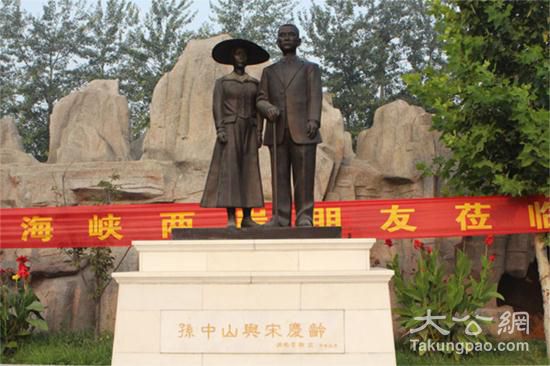 孙中山先生嫡孙女孙穗芳女士在中华孙氏文化园外敬立的孙中山与宋庆龄铜像。 大公网记者李柏涛 摄
