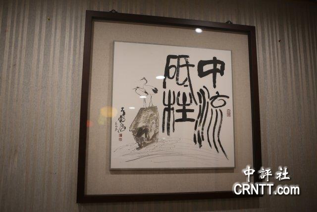 台中广播电台墙上挂着"中流砥柱"的字画。/中评社