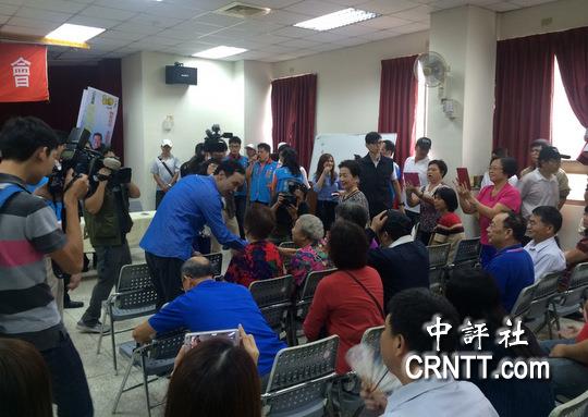 朱立伦出席台中蓝委蔡锦隆举办的基层辅选干部座谈活动,进场后向支持者一一握手致谢。/中评社