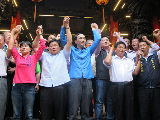 图:国民党主席朱立伦(前中)22日下午到台中市大甲镇澜宫参拜,与党籍立委参选人等一起高举双手直呼“冻蒜!”\中央社