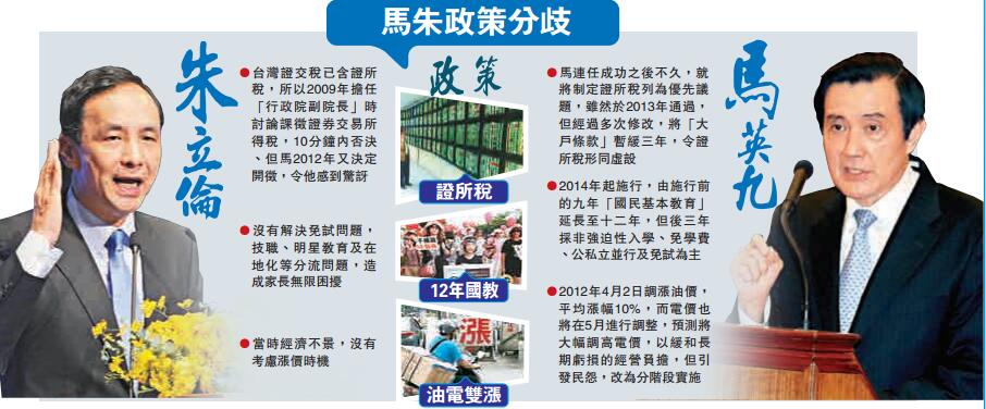 大公网10月30日讯 中国国民党2016“总统参选人”朱立伦28日接受专访时坦承,马英九的证券交易所得税、“12年国教”及油电费双涨是三大错误政策,引发外界认为其切割马英九;朱立伦29日回应称,这些检讨对事不对人。
