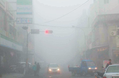 云林沿海9日细悬浮微粒浓度达到“紫爆”最严重等级,加上浓雾,车辆都打开大灯。(台湾《联合报》/蔡维斌摄)