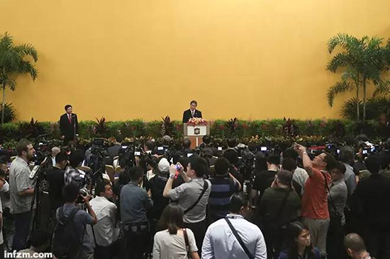 当地时间2015年11月7日,国台办主任张志军在新加坡就“习马会”举行记者会。当日下午,两岸领导人习近平、马英九在新加坡香格里拉大酒店会面。(中新社/图)