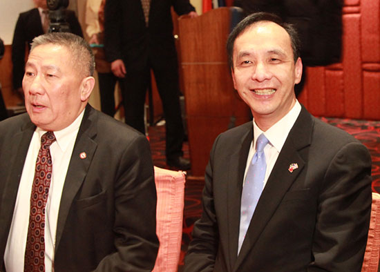 图:13日晚,国民党主席朱立伦(右)抵达纽约并出席侨界举行的欢迎晚宴/中新社