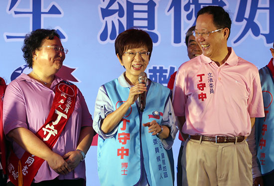 图:“立法院副院长”洪秀柱(中)14日为国民党立委参选人丁守中(右)站台/中央社