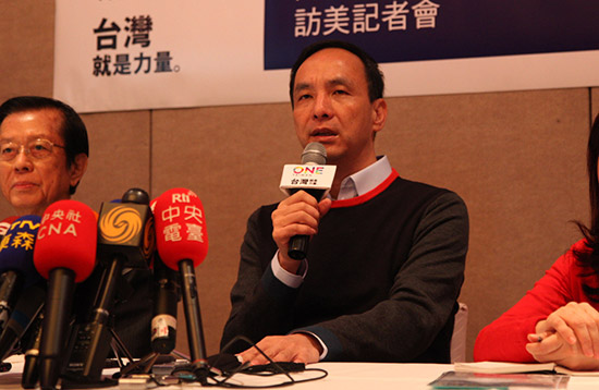 图:中国国民党主席朱立伦14日在纽约举行记者会,介绍此次访美之行的主要成果,并感谢美方安排和当地侨社的热情接待/中新社