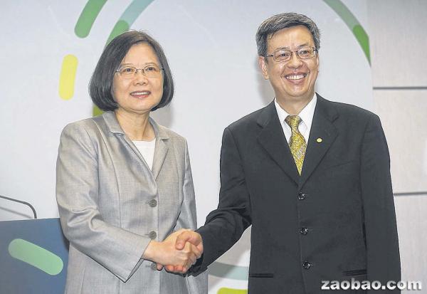 台湾在野党民进党总统参选人蔡英文(左)昨日党总部正式介绍其副手陈建仁(右)。(路透社)
