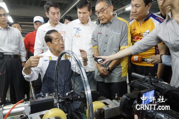 亲民党主席暨2016参选人宋楚瑜上午到桃园参访中小企业,对于功学社(KHS)生产的轮框校正详细询问,认为施政方向要正确,骑车才不会抖动不安。/中评社