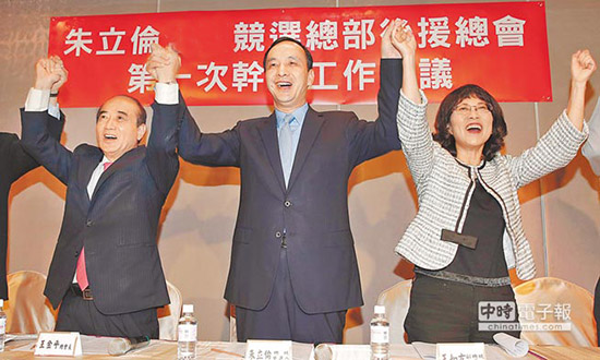 朱立伦竞选总部后援总会干部工作会议上,朱立伦(中)与搭档王如玄(右)以及“立法院长”王金平同台亮相,拉手高呼当选口号。(图片取自台媒)