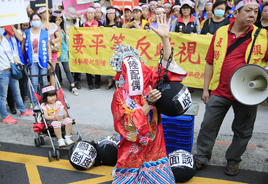 图:台湾多个团体最近在“立法院”前表演行动剧,呼吁将大陆配偶来台取得身份证明时间由六年改为四年。据悉,由于民进党立委阻挠,大陆配偶取得身份证的时间比外国配偶长/中新社