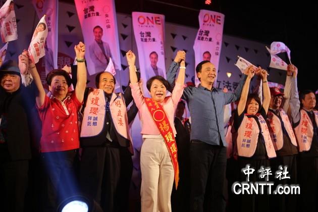 台中蓝委杨琼璎的造势大会上,朱王首度在中台湾合体,副主席黄敏惠及台中红黑派大老廖了以、颜清标等都到场支持,拉抬蓝营选情。/中评社