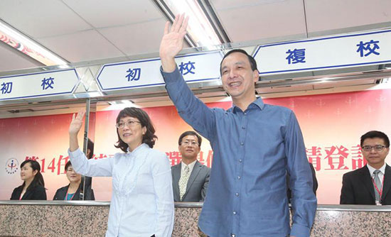 中国国民党2016参选人朱立伦(前右)、副领导人参选人王如玄(前左)25日上午赴“中选会”,正式登记参选。(台媒图)