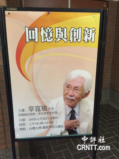 台湾大学农学院演讲厅前张贴欢迎海报。/中评社