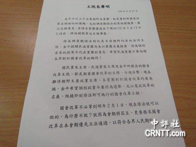 王的声明指出,国民党主席朱立伦、民进党主席蔡英文和他提出的“国会”改革主张,都是朝着“国会”改革的目标分进合击。现在难得朝野主要政党主席、各党团对“国会”改革均有共识,他希望各别党团不要因为选举或以宪政改革的名义,阻挠即刻修法即可施行的“国会”改革工程。