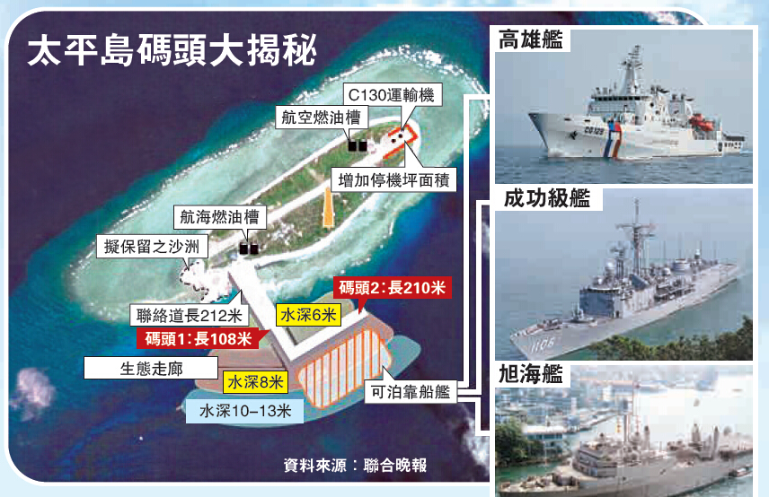 太平岛码头工程于去年启动,经史上最长距离工材运送,并克服洋流与地形限制而按计划完工。太平岛码头功能过去多聚焦在可泊靠3000吨级巡防舰,但在码头设计之初,台湾“国防部”实则也参与需求研议。军方要求船席长度与水深,需供台军外岛运补最大船舰的“旭海舰”靠泊。“旭海舰”是台湾海军接收美国海军“安克拉治级船坞登陆舰”,也是台湾唯一一艘船坞登陆舰,排水量达8600吨。