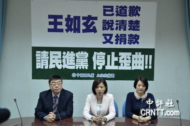 国民党“立院”党团今是由副书记长王育敏、市议员王鸿薇和前“立委”邱毅,共同召开“请民进党停止歪曲”记者会,王育敏表示,社会大众已看到王如玄非常清楚的交代了各项疑问,希望藉这样的说明,整件事的争议可以告一段落,更希望民进党不要再用扭曲、抹黑、政治谋杀的方式,追打此议题,王育敏希望大众多看到王如玄过去在担任人权律师、“劳委会主委”,为妇女、劳工、弱势团体的付出。