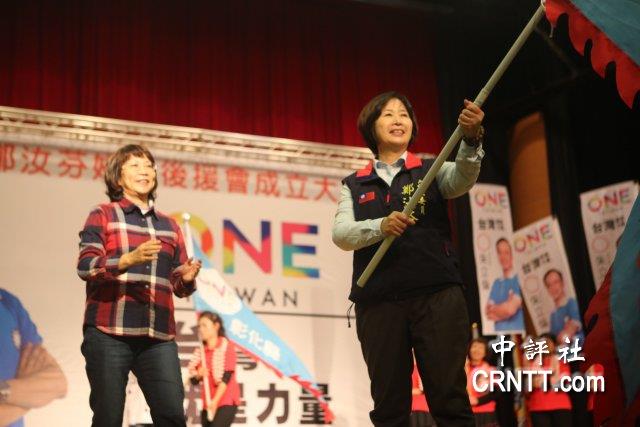 郑汝芬在舞台上挥舞大旗,王如玄在后面拍手加油。/中评社