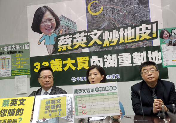 大公网12月11日讯 综合报道:国民党副“总统”候选人王如玄军宅事件还在发酵,10日,民进党“总统”候选人蔡英文又被爆涉及在1988年买进台北内湖重划区15笔土地,再于1997年一口气卖出,至少获利1.8亿元(新台币,下同,约4千万港元),国民党人士表示怀疑其有特权内线,蔡亦被讽为“炒地皮女神”。