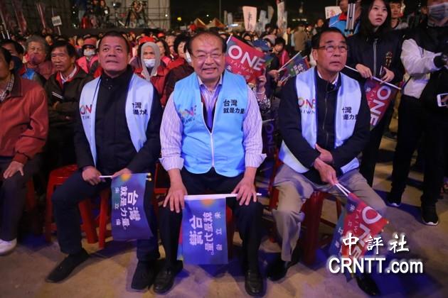 台中蓝营红、黑派大老张清堂(左一)、林敏霖(左二)及廖了以(左三)坐在台下为朱立伦加油。/中评社