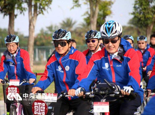 马英九在台当局“行政院长”毛治国、影星成龙、台北故宫博物院长冯明珠等人陪同下,上午出席“故宫南院璀璨登场,低碳乐活单车行”活动,从高铁嘉义站自行车广场骑单车出发。