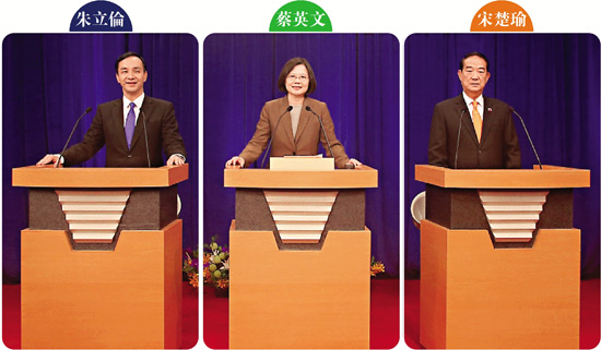 25日晚,首场“总统”候选人电视政见发表会在民视登场,三党“总统”候选人朱立伦、蔡英文、宋楚瑜(左起)就位 中央社