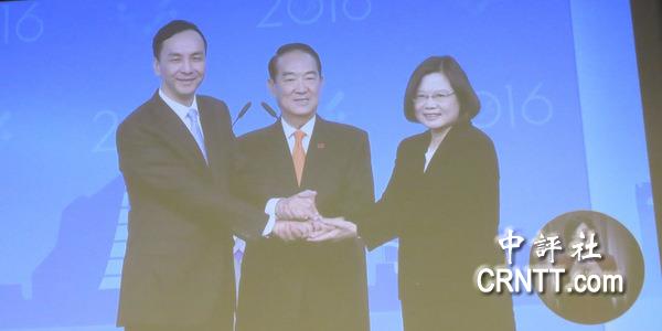 朱立伦、宋楚瑜、蔡英文3人相互握手、并一起手致意后,正式展开电论会。/中评社