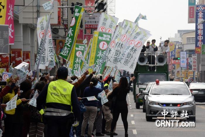 蔡英文台南车队游行,支持者到马路旁摇旗欢迎。/中评社