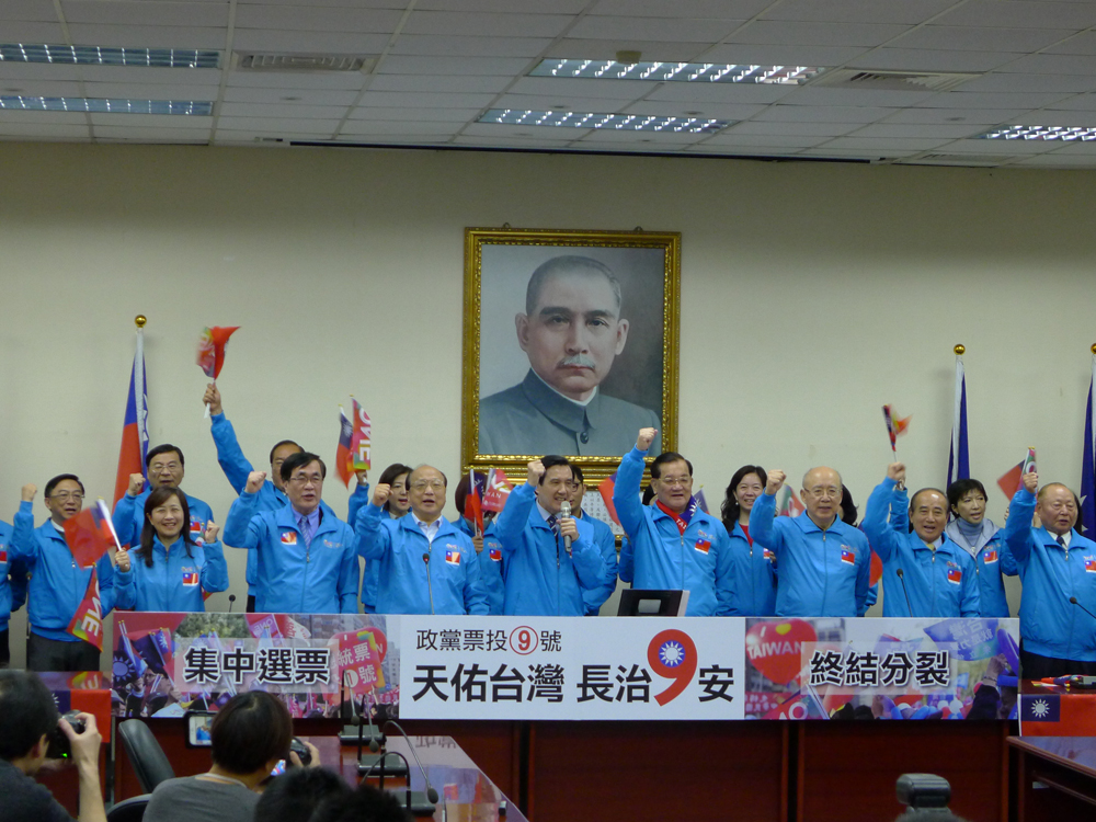 国民党中央14日上午召开“选前恳托记者会”,马英九,国民党前主席连战及吴伯雄,“立法院长”王金平,朱立伦竞选总部主委胡志强,中华战略学会理事长、前黄复兴党部王文燮率领20多位不分区立委候选人一起出席记者会。众人把右手放在胸前,左手作出比赞的手势,以示支持国民党的信心和决心。主席台前亦打出了醒目的“终结分裂”、“长治‘9’安”等横幅,呼吁选民勿“分裂投票”,将政党票投向9号国民党。