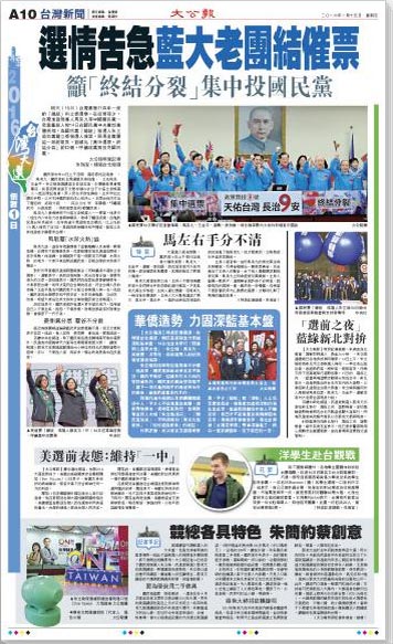 大公网1月15日台北讯(记者朱瑞宜、钱璐) 明天(16日)台湾将举行四年一度的“总统”和立委选举。在投票前夕,台湾地区领导人马英九等中国国民党一众重量级人物14日在国民党中央党部集体亮相,为国民党“总统”候选人朱立伦和党籍立委候选人催票,展现全党团结一致的气氛,并喊出“集中选票,终结分裂”的口号,呼吁政党票投向国民党。