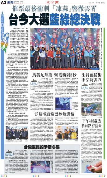 大公网1月16日讯 (特派记者朱瑞宜、钱璐台北报道)台湾将于今天(16日)举行“总统”和立委选举投票。蓝绿阵营谁胜谁负,即将揭晓。各党派都把握15日晚上选前最后的拉票时间举行盛大的造势活动。国民党在新北市和台中市同步举办大规模晚会,固守关键的北台湾,而喊出“决战淡水河”口号的民进党也在新北市板桥区与台北市同时举行晚会。大台北地区当晚虽然下着密雨、又冷又湿,但各阵营的支持者激情高涨,“冻蒜”(当选)口号响彻云霄。