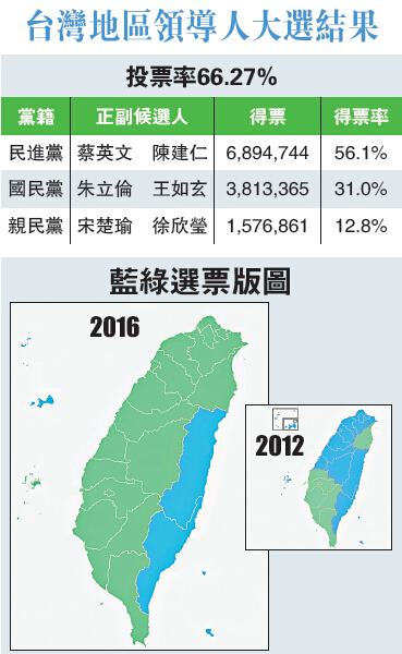 大公网1月17日讯 (记者朱瑞宜、钱璐台北报道)台湾地区领导人选举16日举行,代表民进党参选的党主席蔡英文以689万馀票当选,而民进党在立委选举上亦拿下过半数议席,达到全面执政,对手国民党主席朱立伦承认落败。蔡英文表示将致力确保海峡两岸关系维持和平稳定的现状,以创造台湾人民的最大利益和福祉。中共中央台办、国务院台办负责人16日晚表示大陆对台大政方针不因选举结果而改变,并称愿意与所有认同两岸同属一个中国的政党和团体加强接触交流。